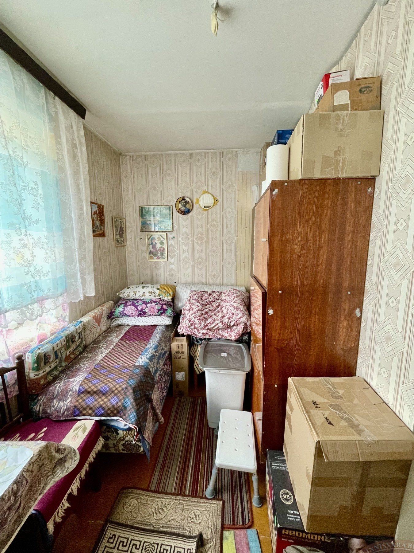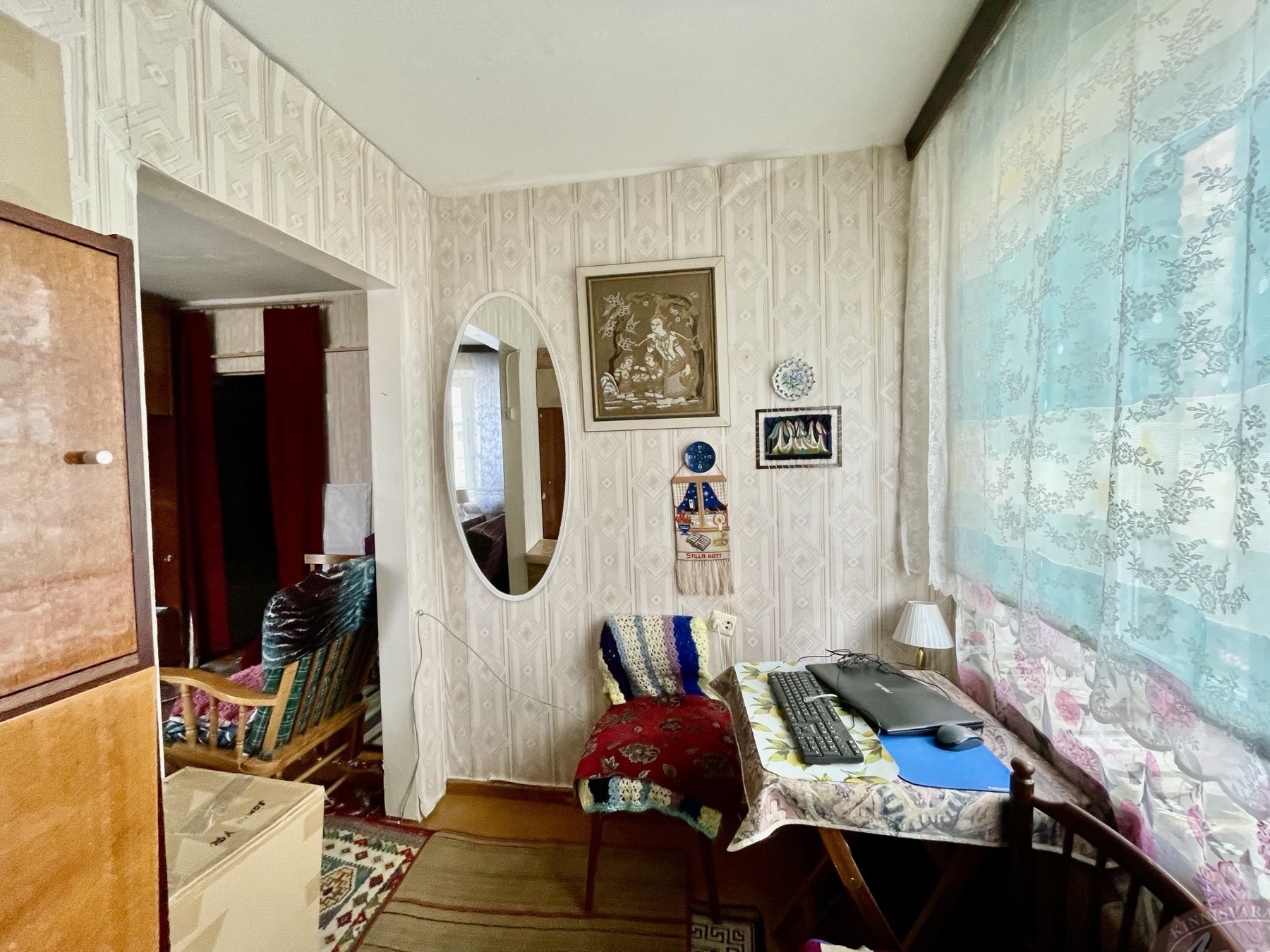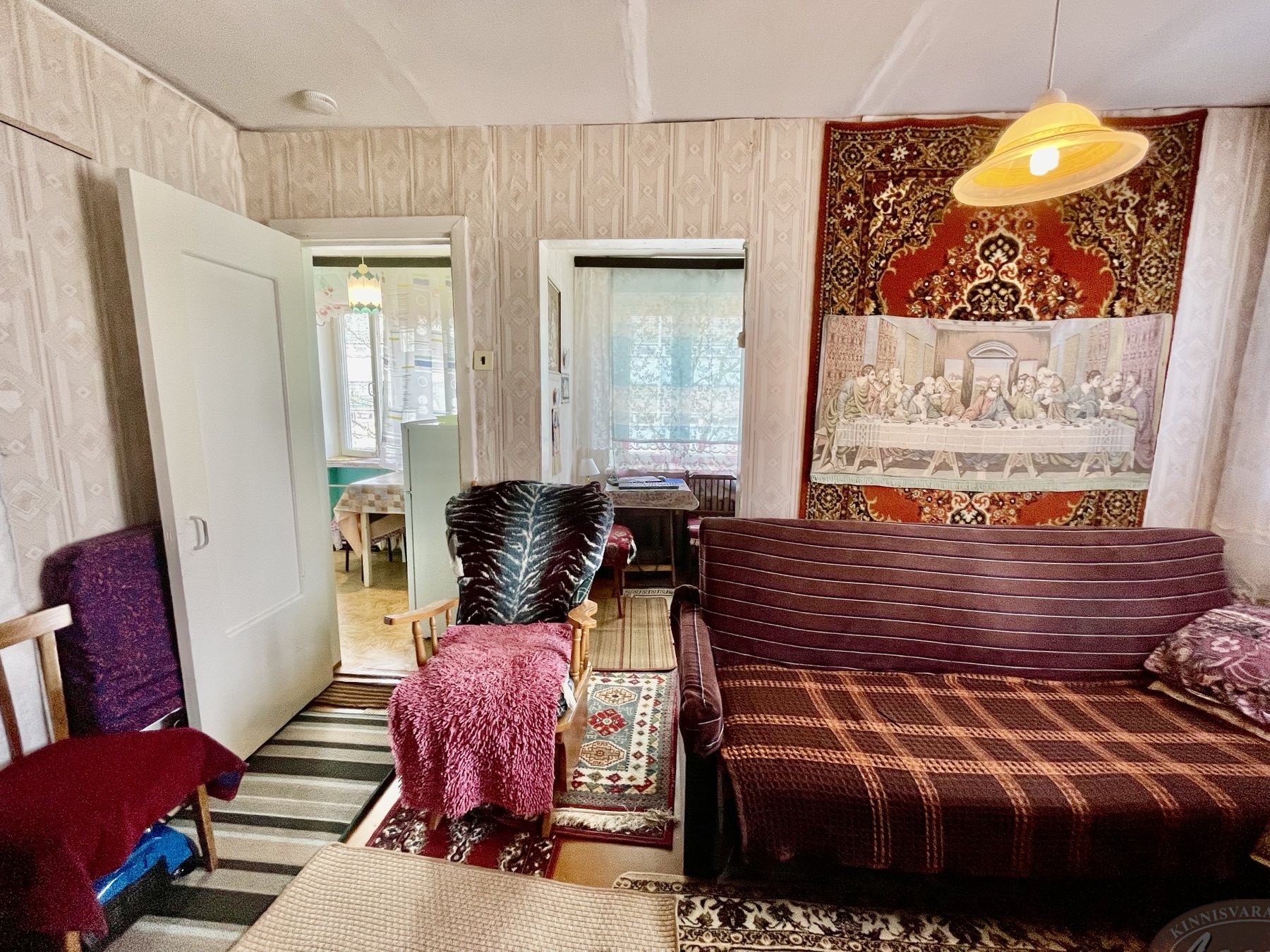 Aknad ja uksed on vanad, radiaatoreid ei ole vahetatud. Aknad avanevad maja kahele poole. Tubade seinad on kaetud tapeediga, laed värvitud, põrand on värvimiseks ette valmistatud. Toas on paigaldatud vahesein, mille abil on loodud teine väike tuba – konstruktsioon on lihtsasti eemaldatav. Ümberplaneeringuid ei ole tehtud.