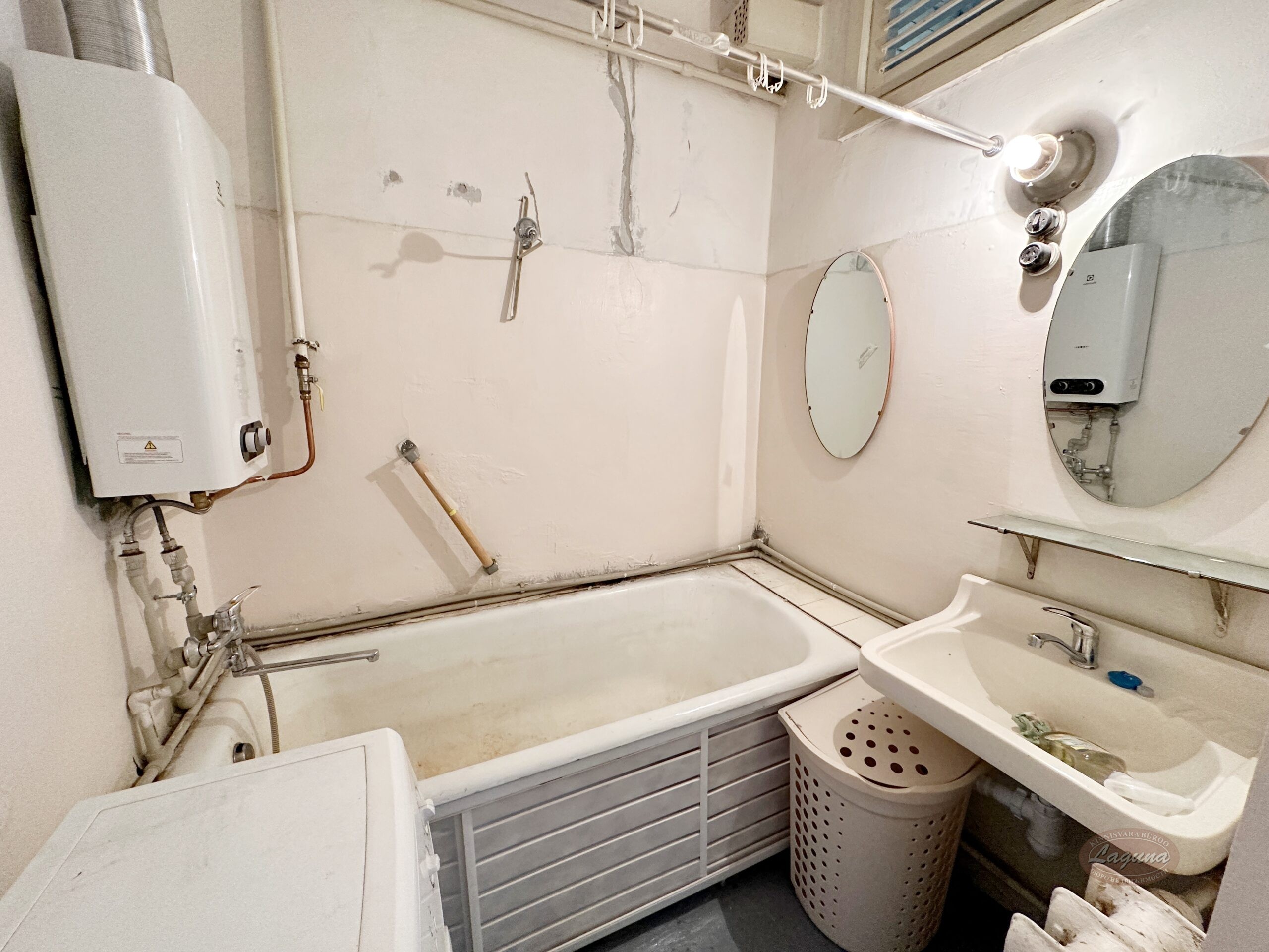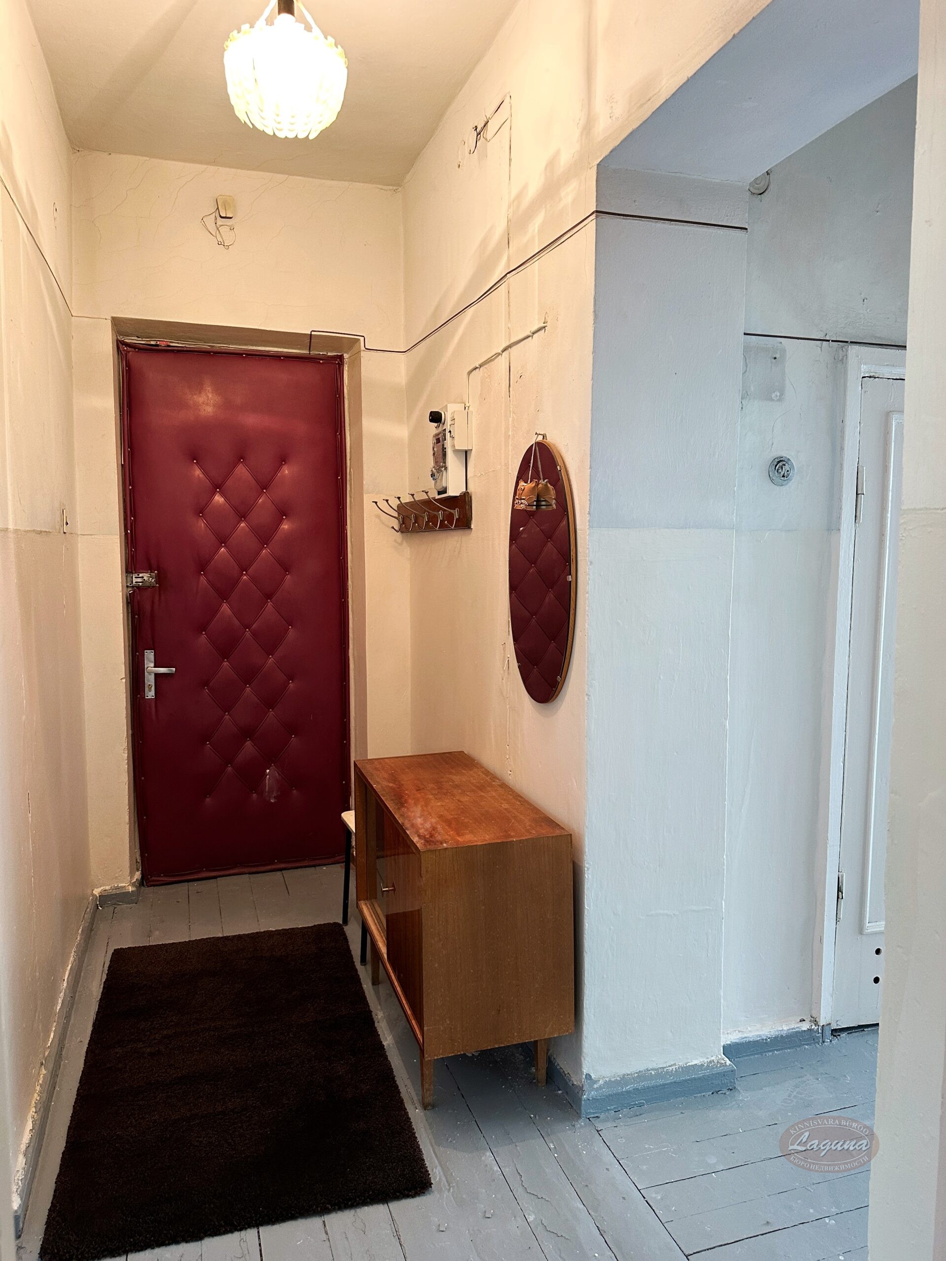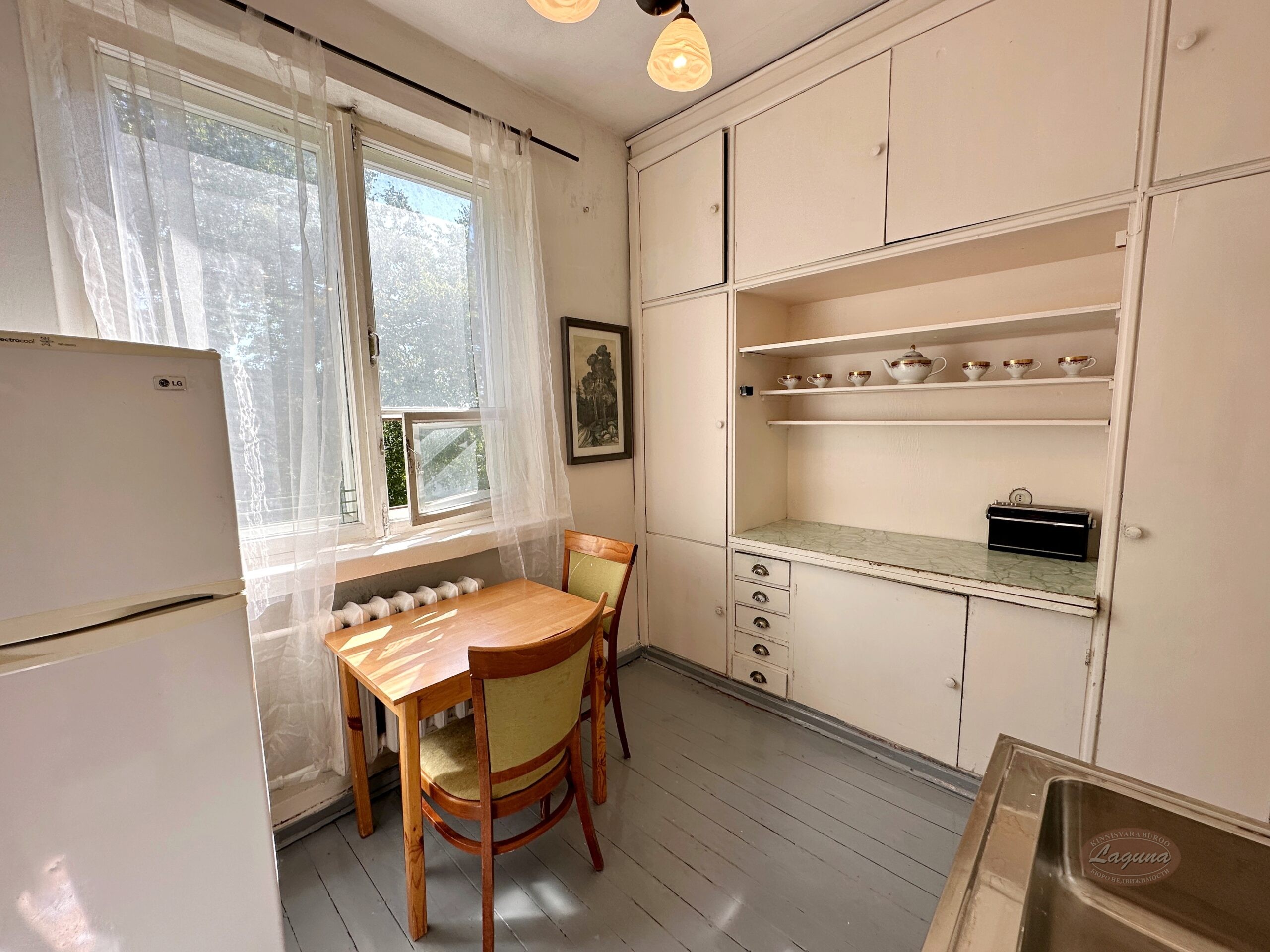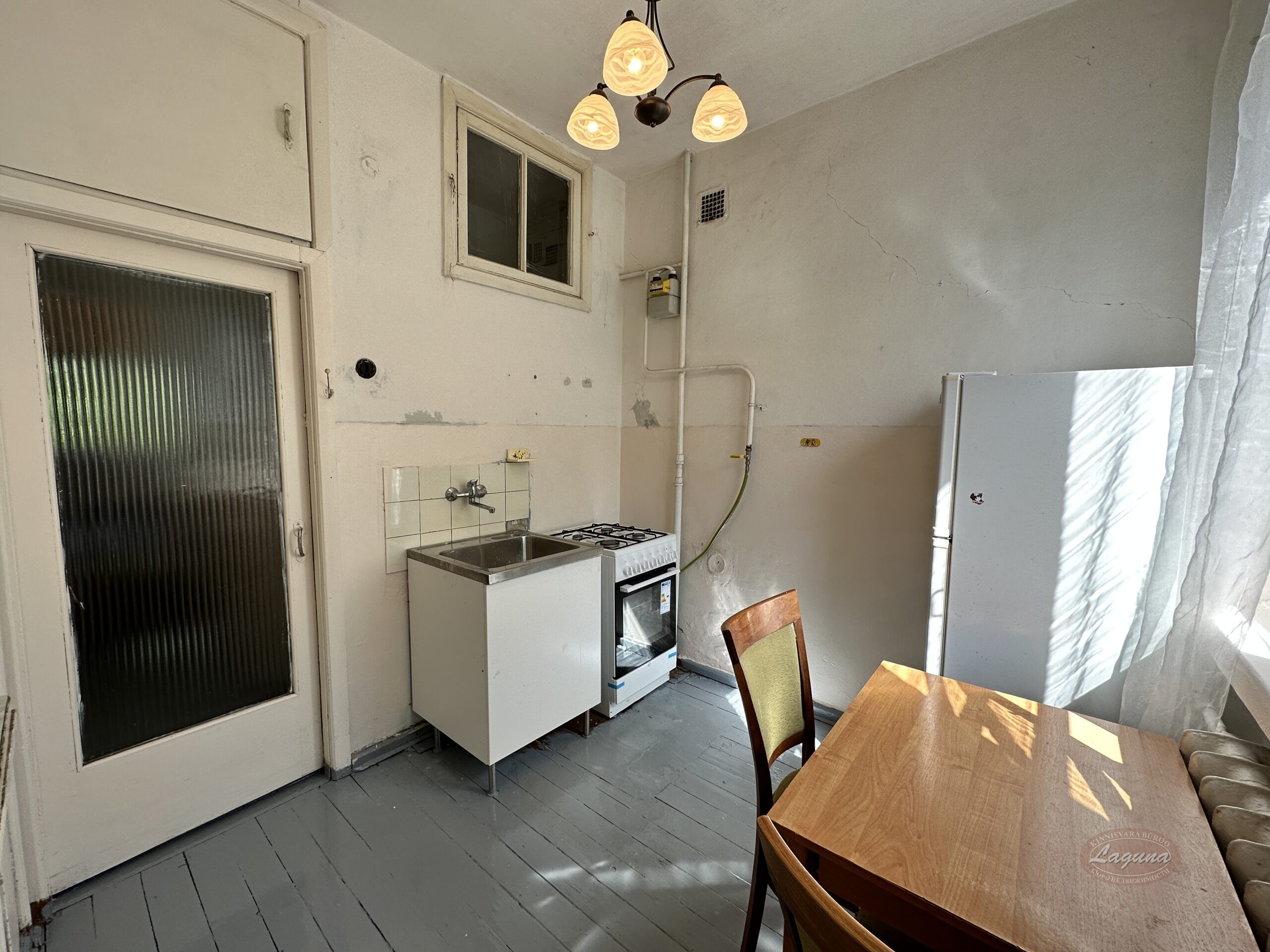 Квартира в среднем состоянии, меблирована. На кухне есть холодильник, газовая плита (новая), стол и стулья.