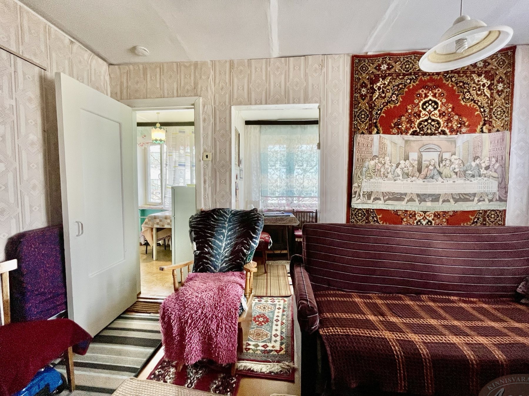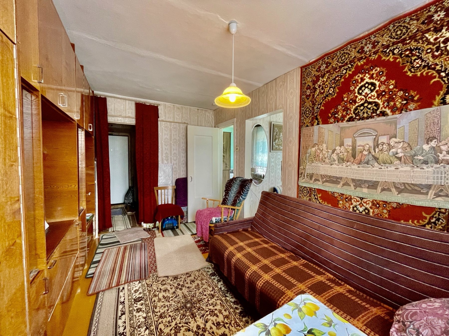 В комнатах стены оклеены обоями, потолки покрашены, пол — папка под покраску. В комнате установлена стена- перегородка и сделана вторая комнатка. Конструкция быстро разбирается. Перепланировок -нет.